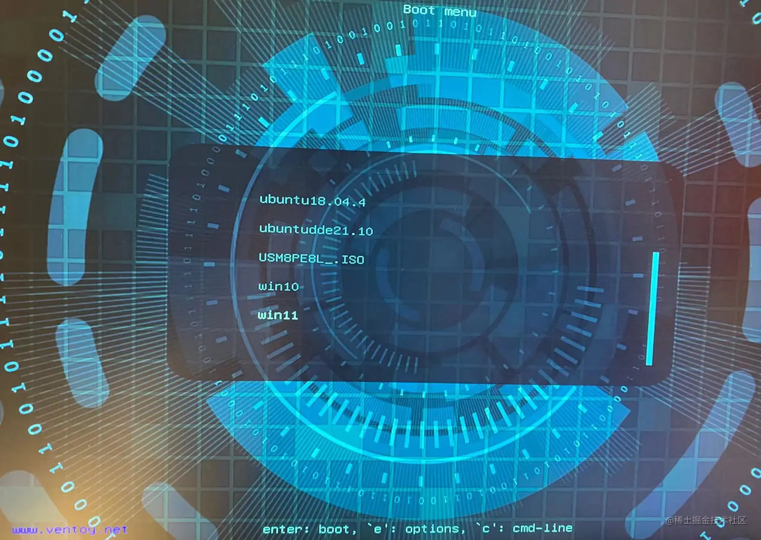 如果你在制作启动盘的时候没有设置主题,你看到的 U盘启动页可能会跟此处显示的不一样。设置 U盘启动页面可以参考:ventory 主题设置