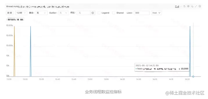 上图展示了业务容器的线程数监控。所有容器的线程数都已经达到 1w,而弹性云默认限制容器的线程数上限就是 1w,设定该上限的原因,也是为了避免单容器线程泄漏而耗尽宿主机的线程资源。