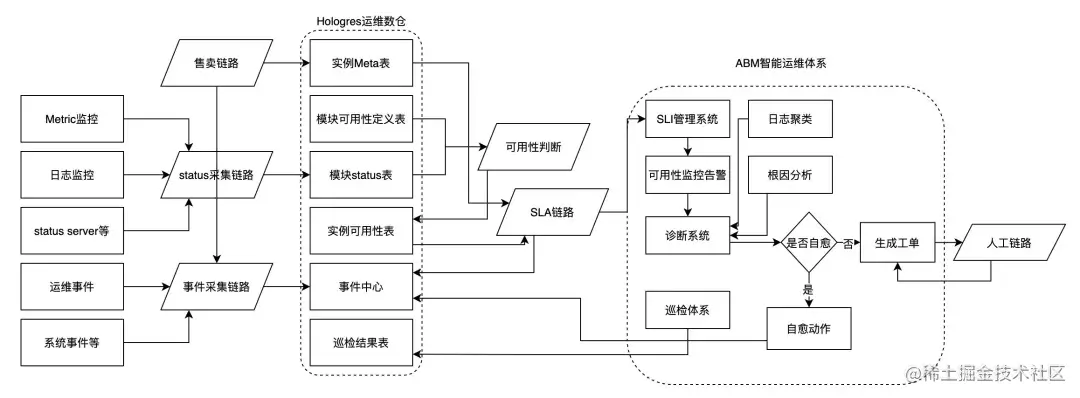 基于Hologres运维元仓的数据和实例可用性定义,我们建立了Hologres实例级别可用性的管理系统,实例可用性数据会进入ABM的SLI数据库,SLI根据数据和条件触发实例可用性监控,在监控发出的同时,会触发实例的诊断,系统根据诊断结果,判断是否进行自愈,如果是已知可以自动恢复情况,会触发自愈,进行故障的自动恢复;如果是未知情况,会触发生成人工工单,工单系统会由人跟进完成,并逐步形成自愈的action。