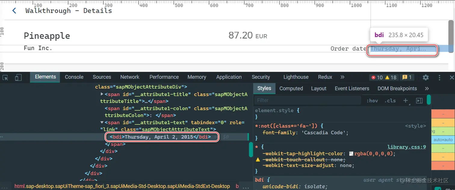 我期望在 SAP UI5 上显示的格式为 某年-某月-某日-T-小时-分-秒,但是最后的显示效果如下图:April 1,2015
