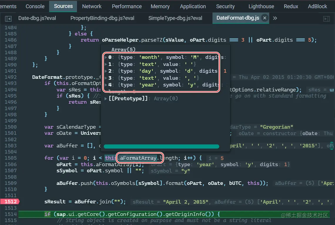 在前一篇文章,我们已经排除了这个问题是由于数据解析错误造成的,因为在 DateFormat.js 的 _format 方法输入参数 oJSDate,已经能够观察到正确从本地 JSON 文件解析出的包含了小时,分,秒的时间值:Thu Apr 02 2015 01:20:30 GMT+0800 (China Standard Time)