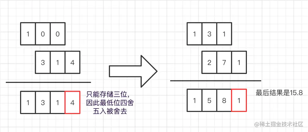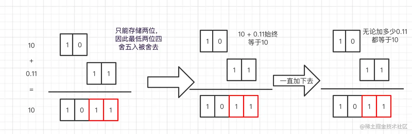 我们都知道,计算机中,数字都是以二进制的形式存储的,在我们最初的例子中,0.1 和 0.2 虽然在十进制中是一个有限小数,但是转化为二进制后,却是一个无限小数,这导致了在存储 0.1 和 0.2 时,其实已经存在一定的精度丢失,而这样计算结果自然也存在误差。那我们能下结论说精度问题是因为参与运算的数值不能精确存储导致的吗?