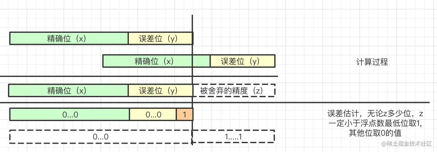 从图中可以看到,在单次计算时,由于存储限制而被舍弃的精度 z,一定小于计算结果高位全是 0,只有最低位是 1 的数值,我们用大写 Z 记录这个只有最低位是 1 的值,由于被舍弃的精度一定小于 Z,我们可以用 Z 来约束单次计算的误差,即单次计算的误差 z < Z 是恒成立的。