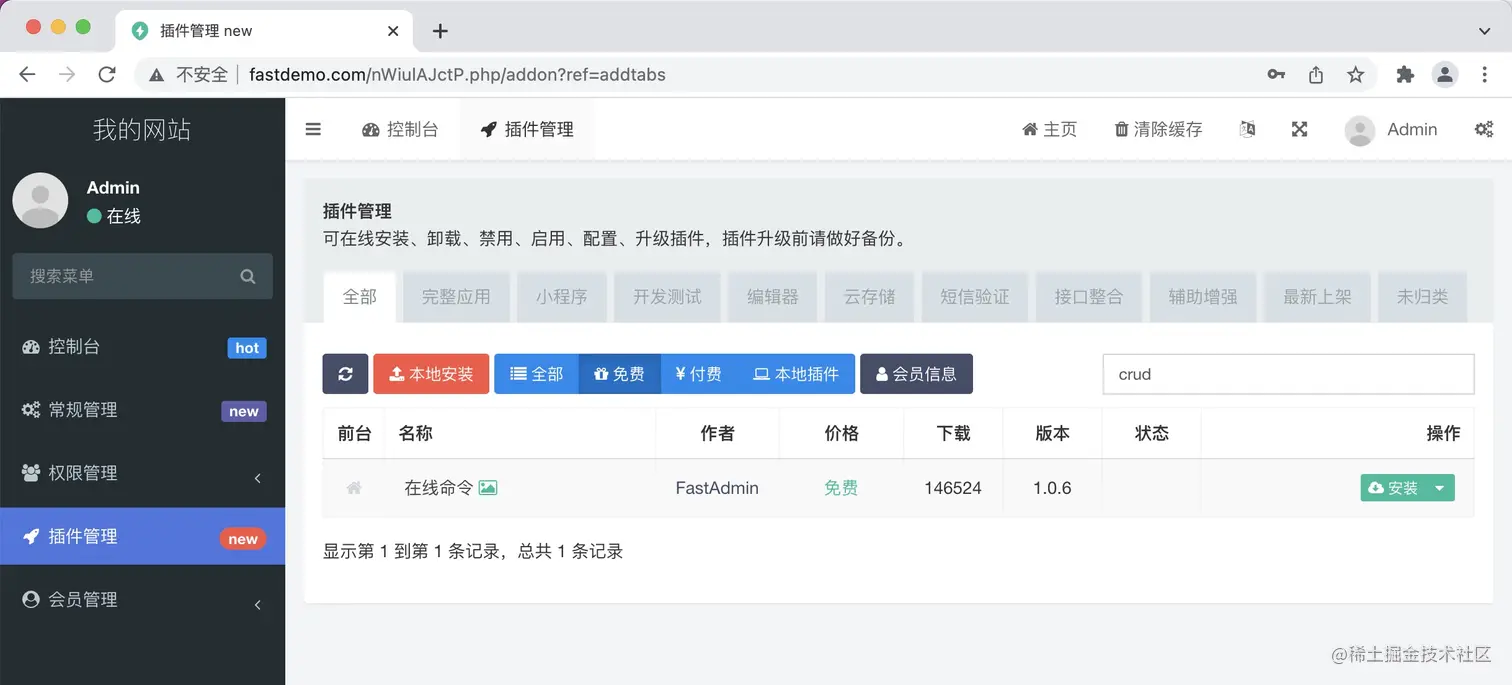 我们登录系统后台点击插件管理列表,搜索crud,点击安装,注意还需要登录下官方账户。安装成功后会在左侧菜单栏中显示“在线命令管理”,如果没有显示就清除下缓存。