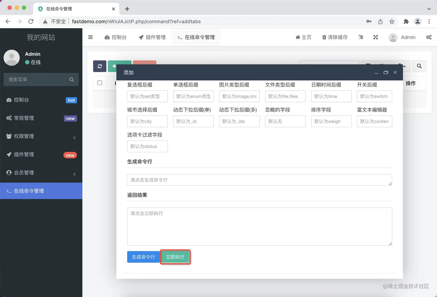 点击左侧在线命令管理菜单,点击添加,在一键生成CRUD标签下选择我们要生成的数据表,还可以选择关联模型用来完成连接查询。可以对字段识别进行设置,我们设置完后滚动下拉,翻到最下方,点击立即执行。就能在命令管理列表中查看执行的结果了。