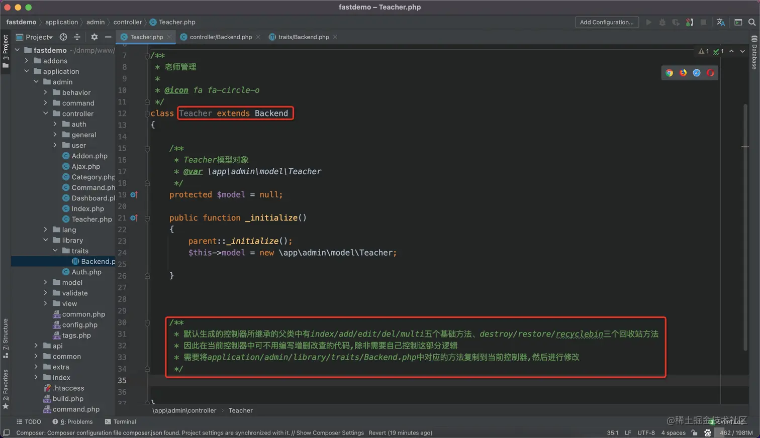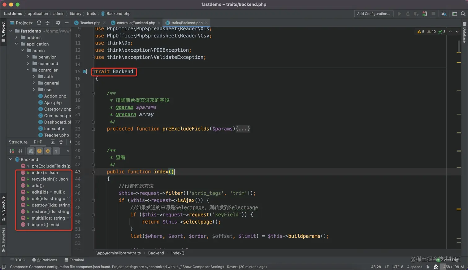 Teacher.php控制器继承了Backend控制器,Backend控制器引入控制器traits下的Backend.php。