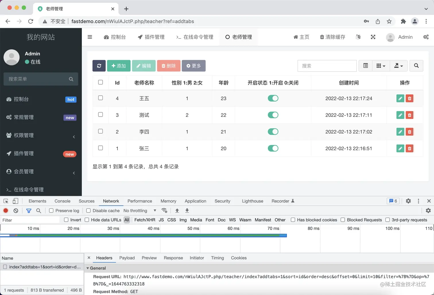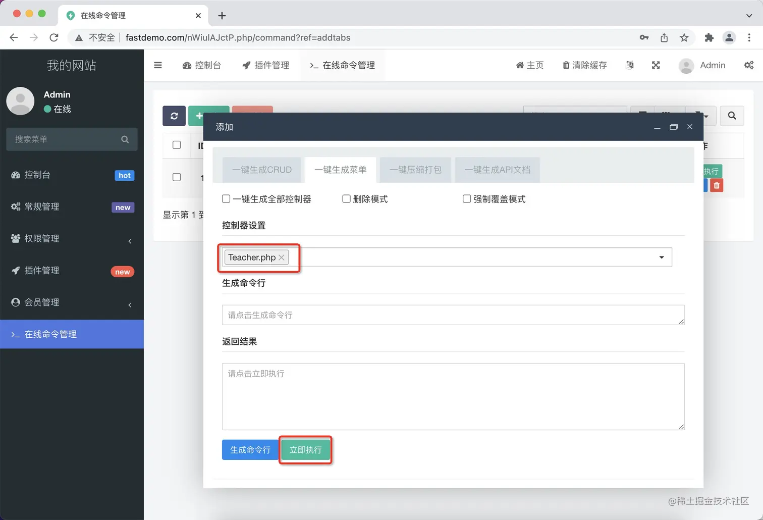 在上一步我们一键生成CRUD后,这个时候代码已经生成了,我们来添加菜单,还是点击添加按钮,选择一键生成菜单,选择我们上一步生成的数据表名称对应的控制器,也就是Teacher.php控制器,点击立即执行按钮,就能在左侧看到老师管理列表了。