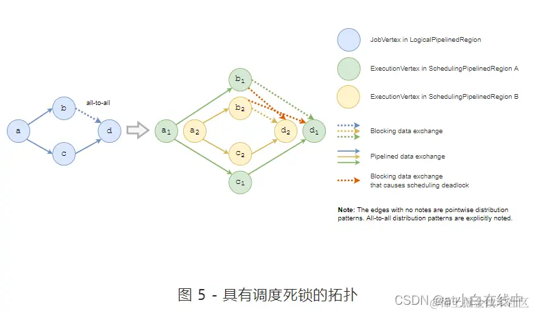 在构建流水线区域的过程中,会出现一个问题:流水线区域之间可能存在循环依赖。当且仅当其所有依赖项都已完成时,才能调度流水线区域。但是,如果有两个相互之间存在循环依赖的流水线区域,就会出现调度死锁。他们都在等待对方先被调度,而且都无法调度。因此,采用Tarjan 的强连通分量算法来发现区域之间的循环依赖关系,并将它们合并为一个流水线区域。它将遍历拓扑中的所有边。对于 all-to-all 分布模式,边数为 O(n 2)。因此,该算法的计算复杂度为 O(n 2 ),并且显着减慢了调度器的初始化。