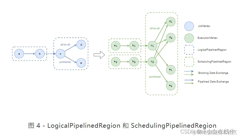 目前,调度器中有两种流水线区域:LogicalPipelinedRegion和SchedulingPipelinedRegion。LogicalPipelinedRegion 表示逻辑级别的流水线区域。它由 JobVertices 组成并形成JobGraph。SchedulingPipelinedRegion 表示执行级别的流水线区域。它由 ExecutionVertices 组成并形成 ExecutionGraph。就像 ExecutionVertices 派生自 JobVertex 一样,SchedulingPipelinedRegions 派生自 LogicalPipelinedRegion,如图 4 所示。