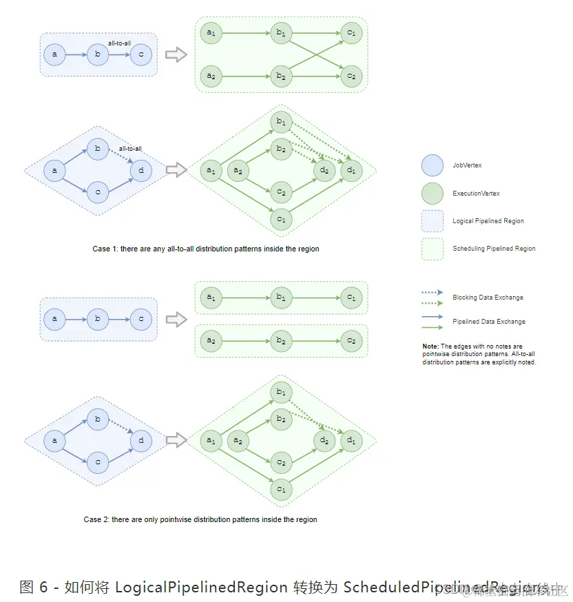 为了加快流水线区域的构建,可以利用逻辑拓扑和调度拓扑之间的相关性。由于一个 SchedulingPipelinedRegion 只派生自一个 LogicalPipelinedRegion,因此 Flink 会遍历所有 LogicalPipelinedRegions 并将它们一一转换为 SchedulingPipelinedRegions。转换根据连接 LogicalPipelinedRegion 中的顶点的边的分布模式而有所不同。