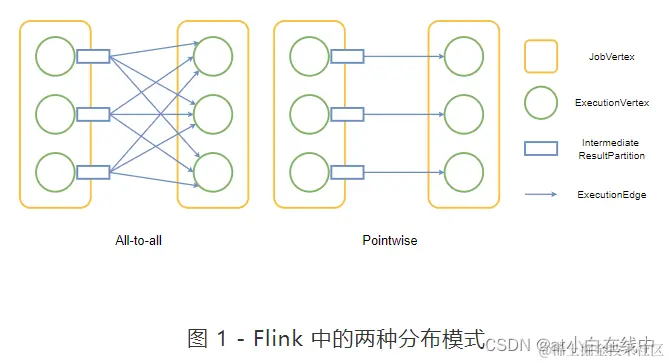分发模式描述了消费者任务如何连接到生产者任务。目前,Flink 中有两种分布模式:pointwise 和 all-to-all。当分布模式在两个顶点之间是逐点分布时,遍历所有边的计算复杂度为 O(n)。当分布模式为 all-to-all 时,遍历所有边的复杂度为 O(n 2 ),这意味着随着规模的增加,复杂度会迅速增加。