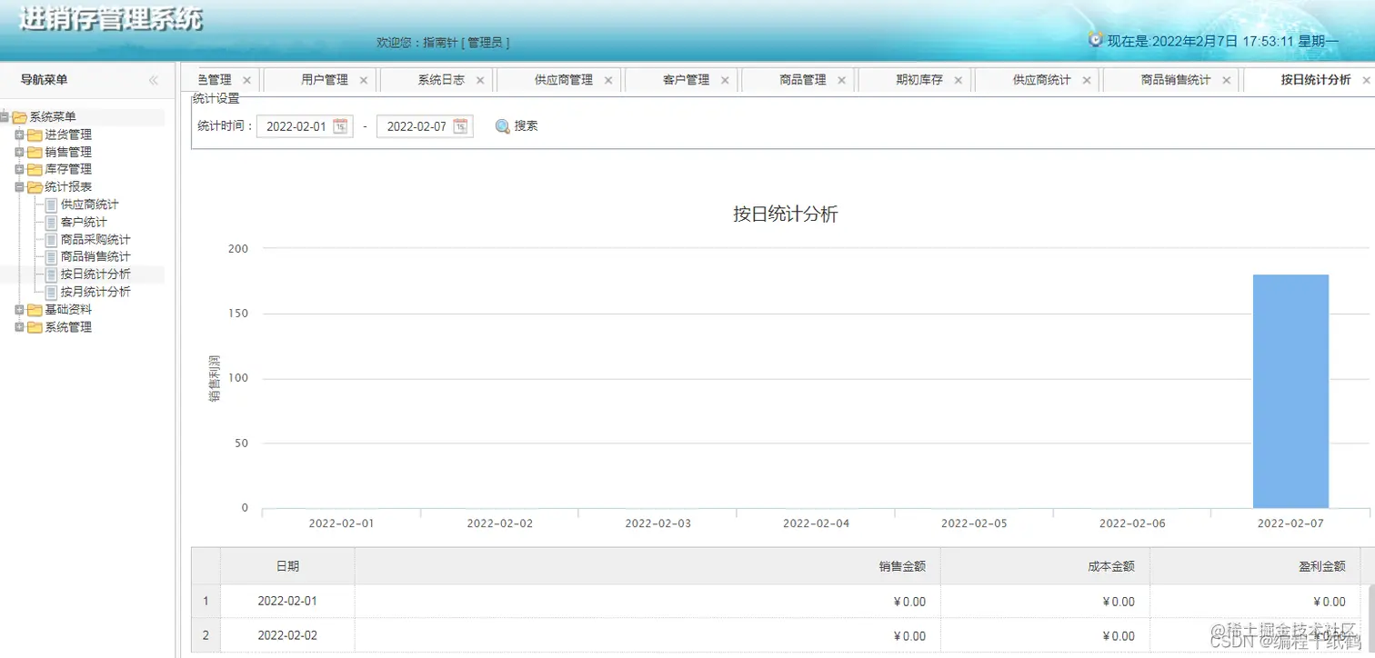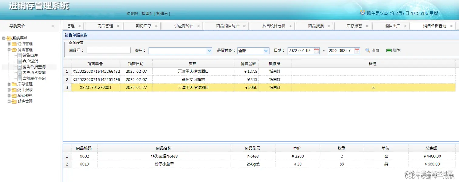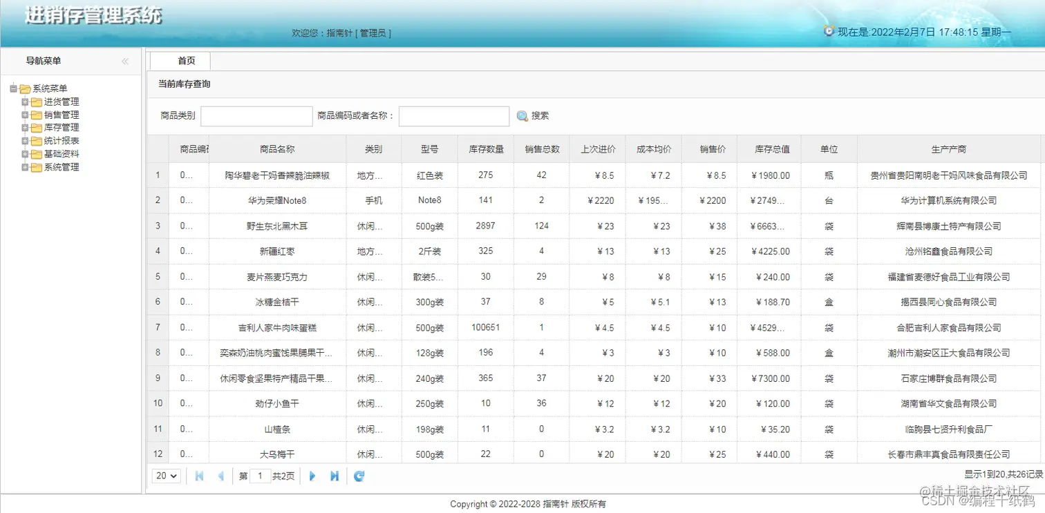 本系统基于springboot实现了一个功能十分完整的企业进销存系统,主要功能包括:用户的登录注册、客户信息增添改查、来往客户信息查询等、商品的进货和销售、采购订单明细、销售订单明细、库存盘点、商品查询及分类、商品价格调整、进销存报表、商品库存预警、系统退出、角色管理、用户管理、权限分配、数据统计图形报表、等等,功能可以说是十分完整,整个系统设计简洁大方,运行无误。