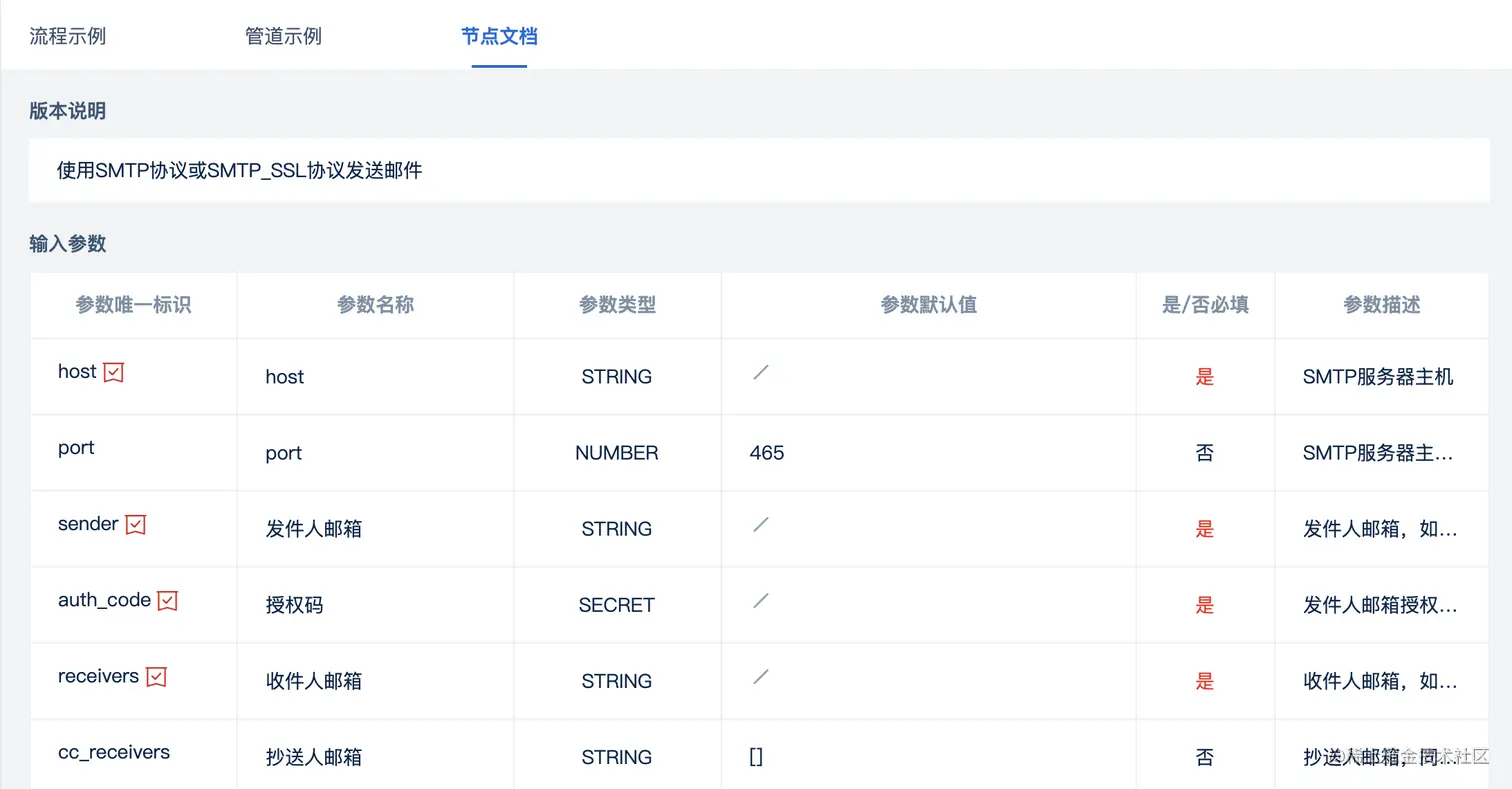 节点文档里面详细描述了每一个参数的信息,可以参考节点文档填写对应的参数