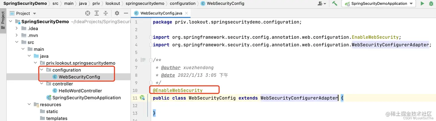 1.创建configuration包,新建一个WebSecurityConfig类,使其继承WebSecurityConfigurerAdapter