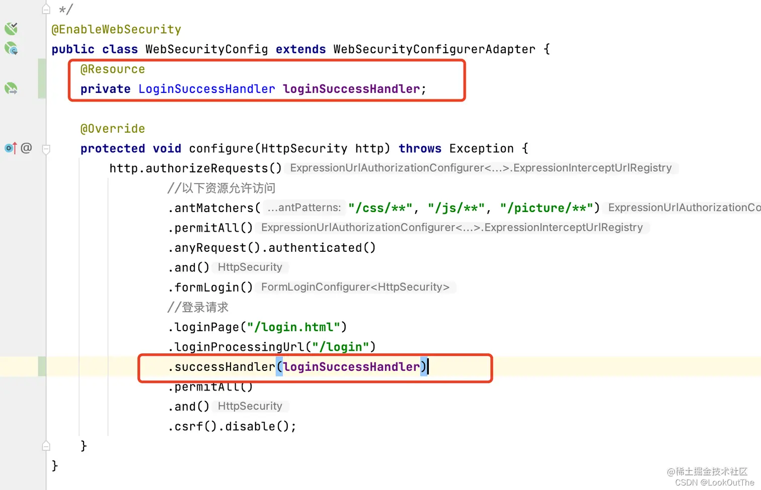 HttpSecurity被设计为链式调用,在执行每个 方法后,都会返回一个预期的上下文,便于连续调用。我们不需要关心每个方法究竟返回了什么、如何进行下一个配置等细节。