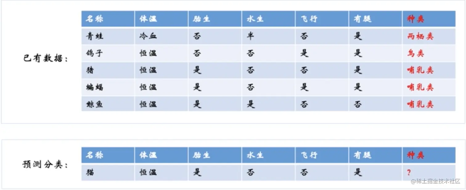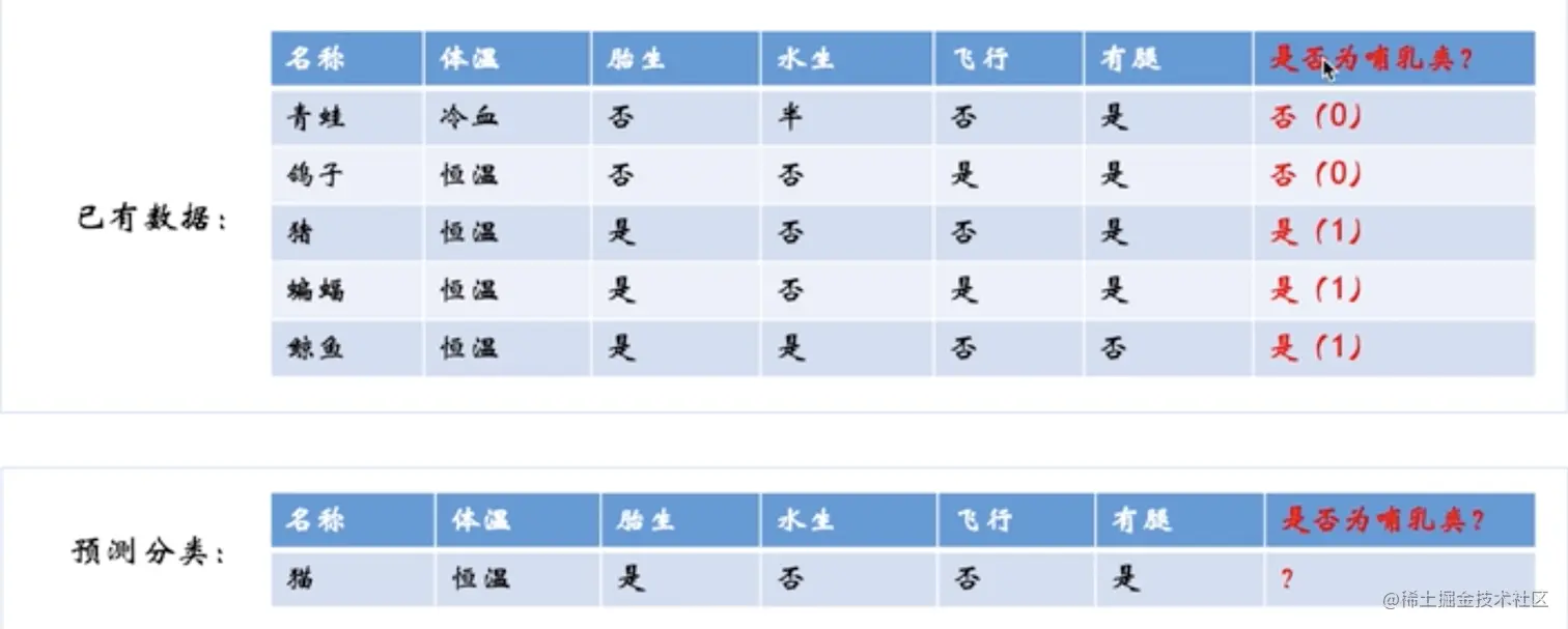 有一条新的数据 知道它的特征 这些特征都属于特征列 预测这个是哪个种类的动物