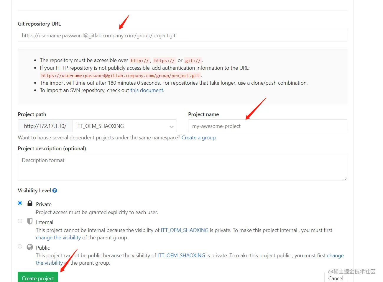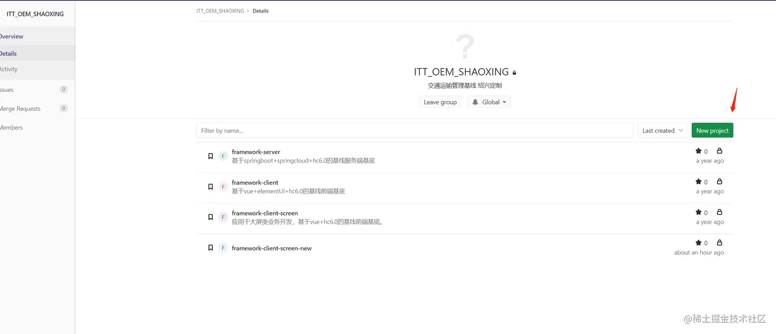 gitlab复制project新建项目 RyfiLucy 2022-02-14 2,748 阅读1分钟 1.选择new project 2.如图所示 3.填写被复制的url,以及新项目名称 4.点击create project, 则被新的项目创建成功,内容和被复制的项目保持一致