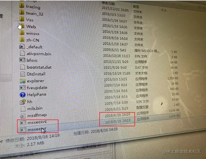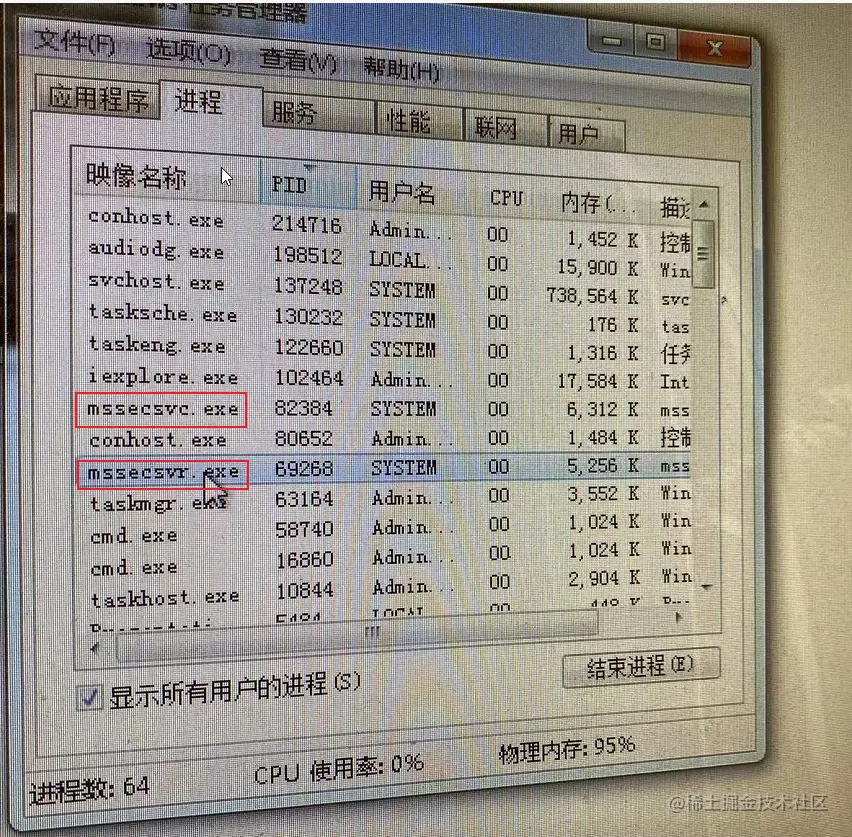 任务管理器,看一下进程,mssecsvr.exe和mssecsvc.exe是wanna cry的勒索病毒