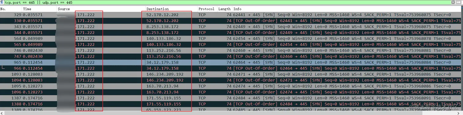 重新调整下wireshark过滤器,tcp.port == 445 || udp.port == 445,查看一下高危445端口有无异常,意外收获,发现171.222这台机器在一直请求公网,觉得有问题,去机器上看下。