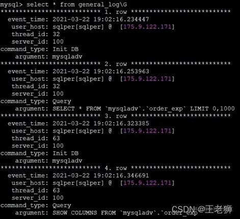 select * from mysql.general_log\G