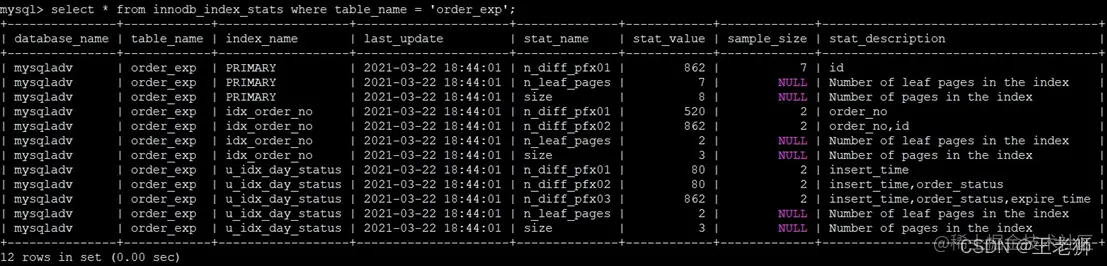 - n_leaf_pages:当 stat_name 字段为 n_leaf_pages 值时,stat_value 字段值表示索引叶子页的数量。