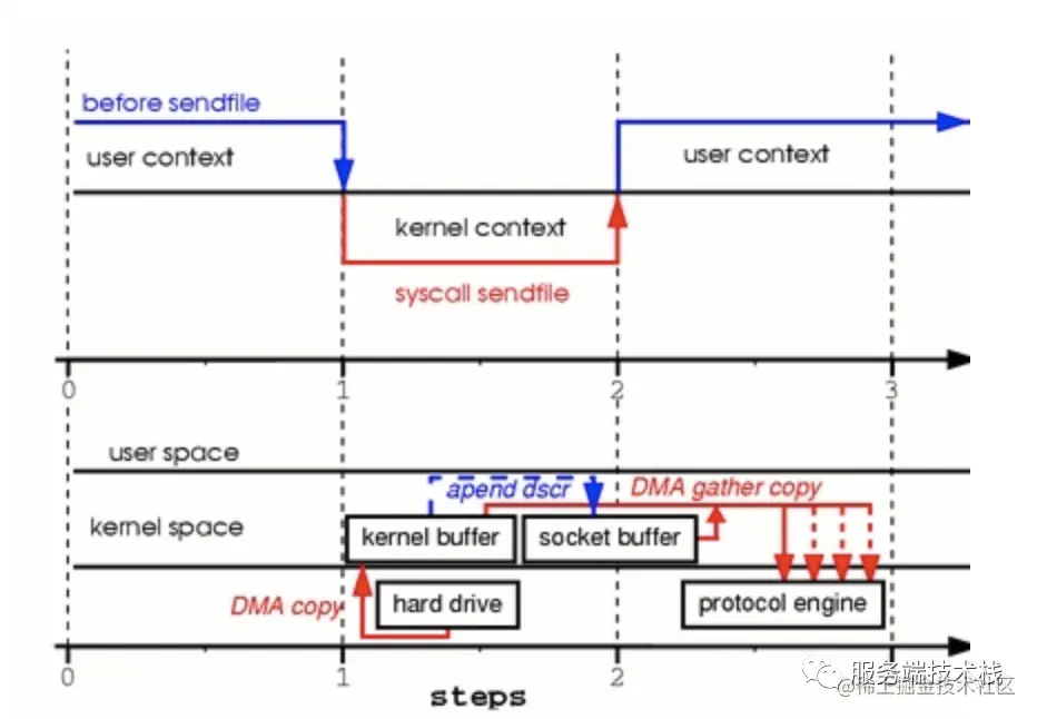 2、没有数据被复制到套接字缓冲区中。相反,只有包含数据位置和长度信息的描述符才会附加到套接字缓冲区。DMA引擎将数据直接从内核缓冲区传递到协议引擎,从而消除剩余的最终副本