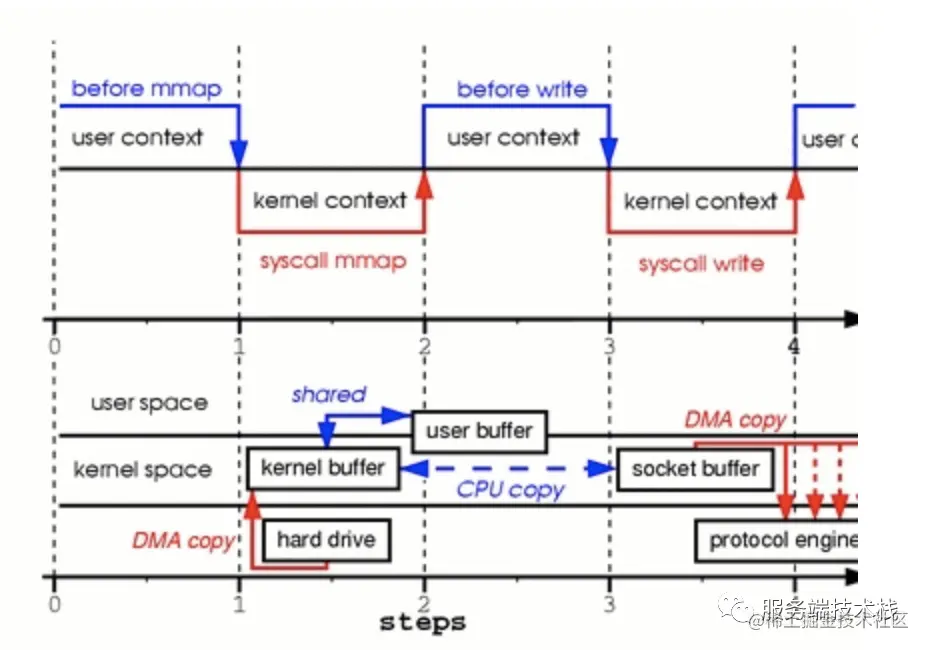 1、调用mmap系统调用,DMA将磁盘数据拷贝到内核缓冲区,随后,内核缓冲区与用户缓冲区共享该数据,并不会发生复制操作