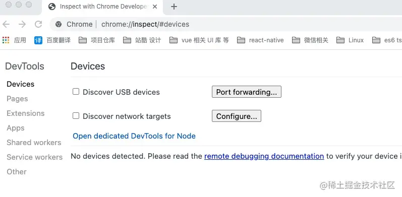 执行命令后,打开浏览器,并导航到 chrome://inspect界面,我们就可以对我们的Nodejs项目进行调试。