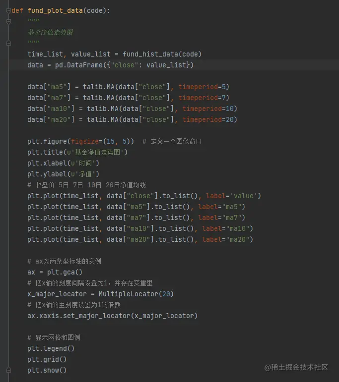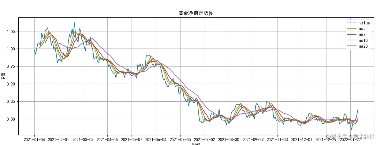 根据前文讲述的基金净值数据,需要将数据进行转换,然后再使用 talib 进行均线的数据计算,然后再使用 matplotlib 将收盘价的数据、均线的数据进行绘制。