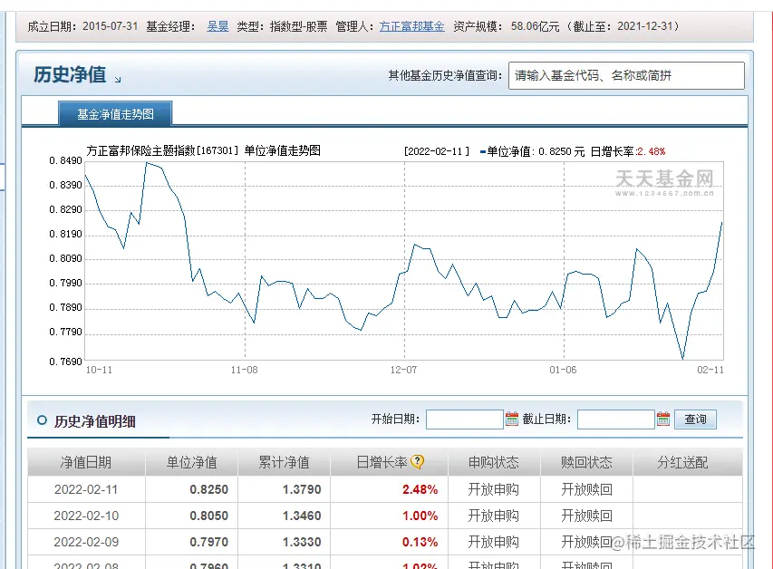本次以方正富邦保险主题指数(167301) 为例进行数据的展示和说明: