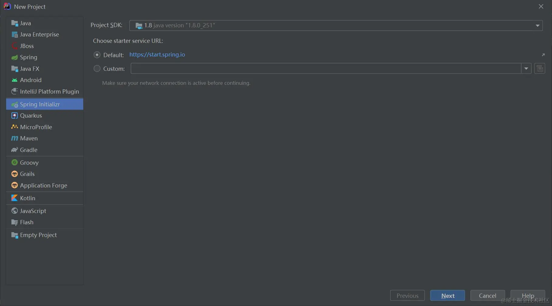 以使用IntelliJ IDEA为例,创建一个SpringBoot项目。点击File->New->Projects...,选择Spring Initializr,如下图: