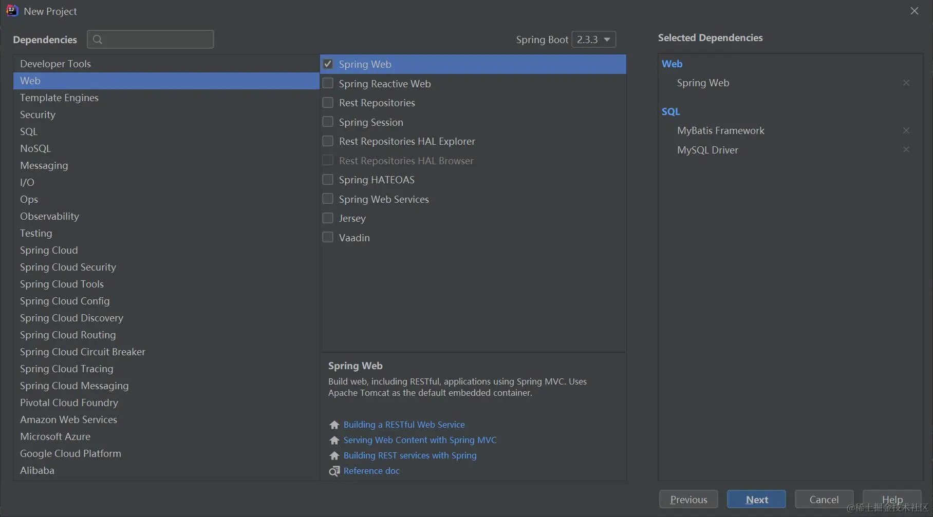 点击Next,选择Web,并勾选Spring Web,如下图: