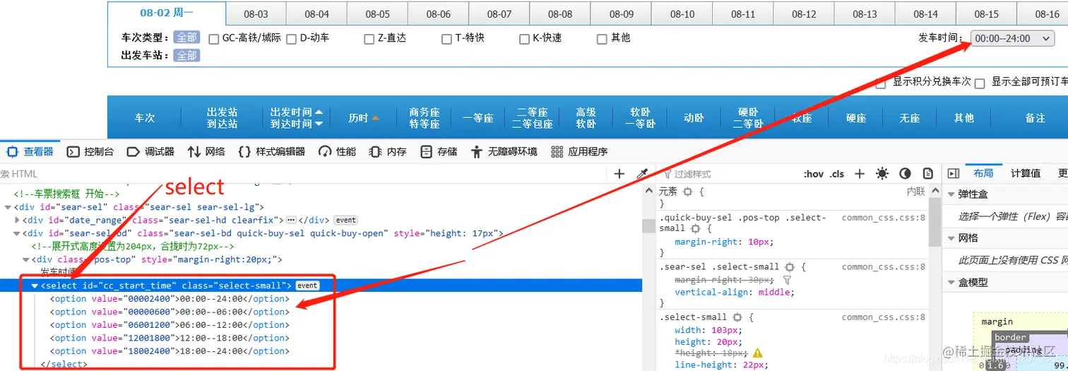 如这个例子,12306购票网站的。看图,我想选中时间,这是一个select标签,我们需要导入一个类才能定位到,并且select给了三种定位方法(实际不止三种,这里我们用的上的只有两种)