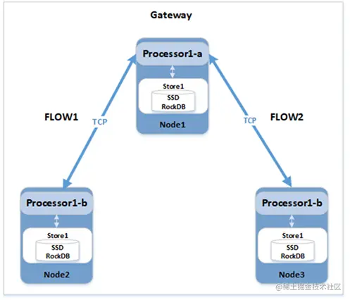 对于跨节点得执行,Gateway node首先会序列化对应得FlowSpec为SetupFlowRequest,并通过GRPC发送到远端node,远端node接收后,会先还原Flow,并创建其包含得processor和交互使用得stream(TCP通道),完成执行框架得搭建,之后开始由网关节点发起驱动得多节点计算。Flow之间通过box缓存池进行异步调度,实现整个分布式框架得并行执行。