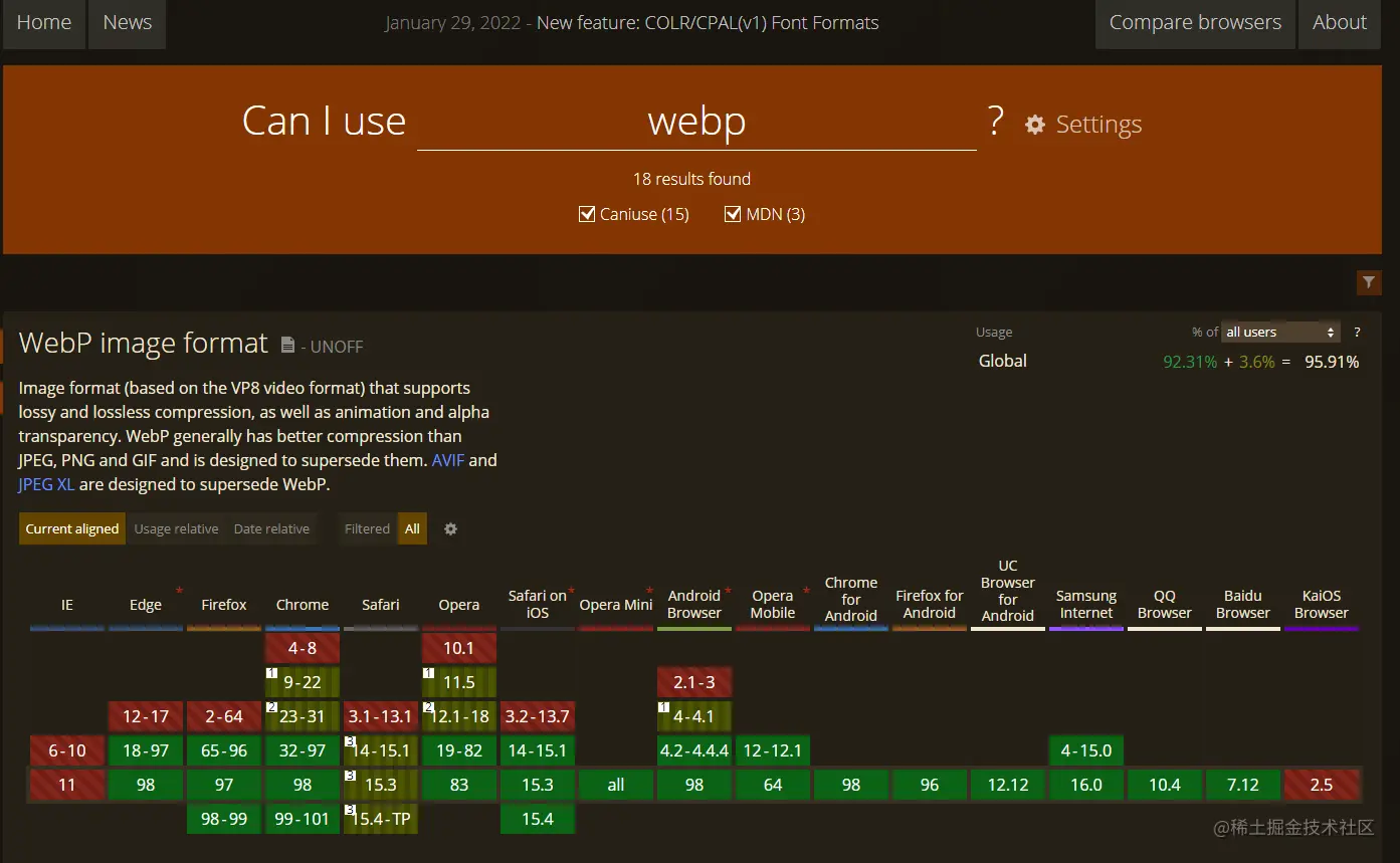 截至到2022年年初,目前大约95.91%的浏览器支持WebP格式的图片,这个支持率已经非常不错了,完全可以应用到生产环境中,针对不兼容的情况下,我们也可以进行降级来处理。