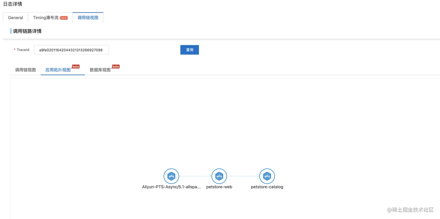 PTS 集成的问题诊断在压测过程中,针对每条请求,会在施压引擎端生成 TraceId,通过 TraceId 将该条请求所涉及到的上下游链路关联起来,用户可以看到从该条请求作为入口到本条请求结束所涉及到的完整调用链,同时,问题诊断会针对该调用链生成相应的应用拓扑视图,可以让用户清晰地看到应用之间的调用关系。