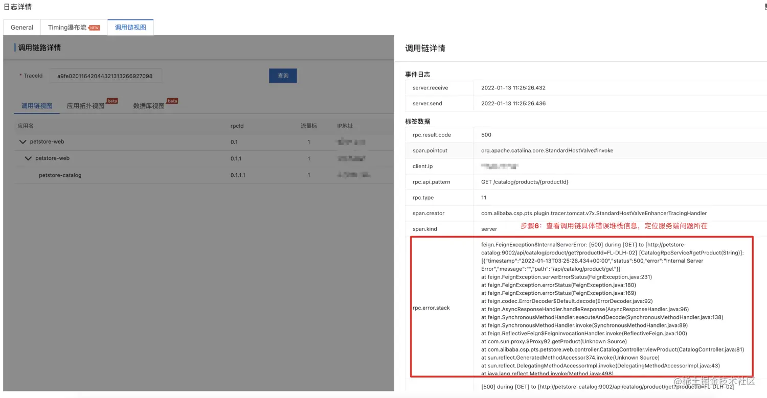 查看调用链具体错误堆栈信息,定位服务端问题所在