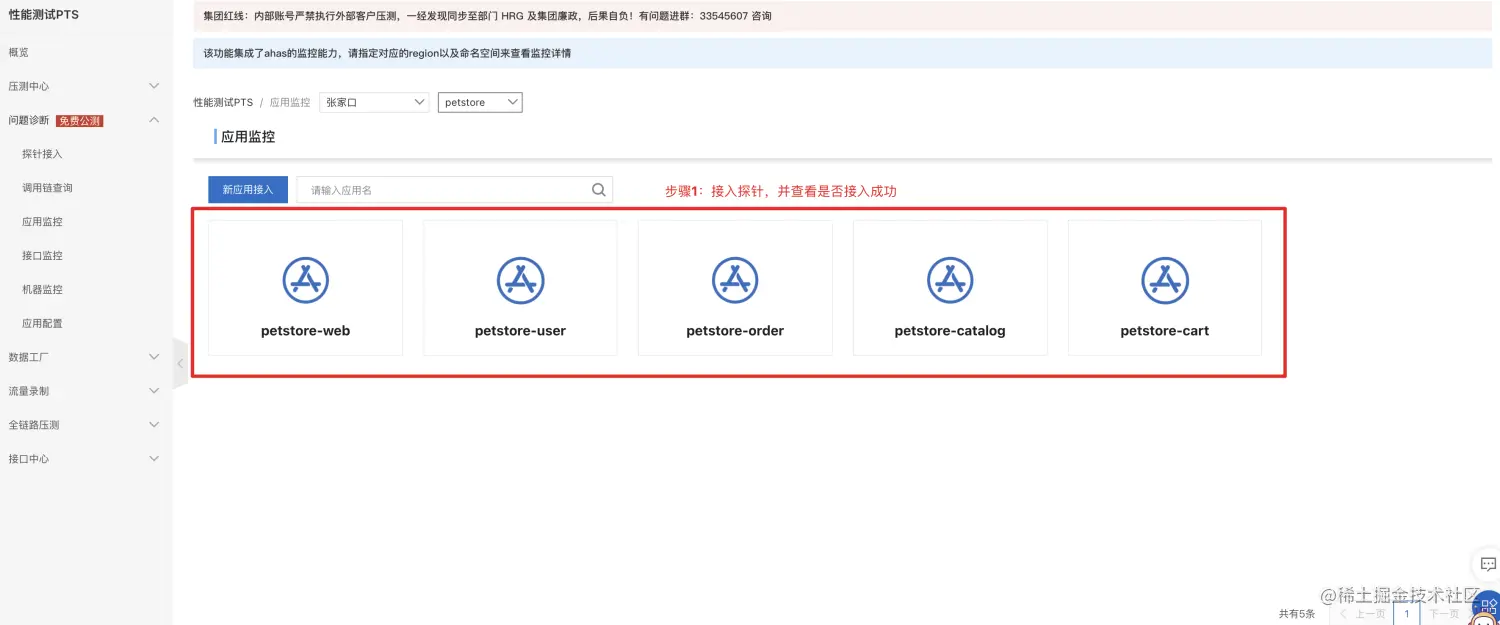 首先,我们将被压场景所涉及到的应用梳理出来,将涉及到的所有应用按照【问题诊断】->【探针接入**[1]】文档中的步骤进行问题诊断探针接入。我们可以在 PTS 控制台的应用配置或者应用监控、接口监控、机器监控中任选一个来查看应用探针是否接入成功。我们本次演示的压测场景涉及到五个应用,分别是 petstore-web、petstore-user、petstore-order、petstore-catalog、petstore-cart,这以应用监控举例来查看应用是否成功接入。依次点击 PTS 控制台的【问题诊断】->【应用监控[2]**】->选择我们配置的 Region 以及 Namespace,如果看到压测场景涉及到的所有应用均在该页面,则代表应用接入成功。