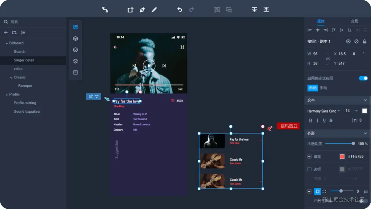 在这款工具里,常用的移动端、PC端设计组件基本上都有,还有海量的预置图标,拖拽到画板就可以快速绘制原型,所有组件及图标的参数设置非常直观。