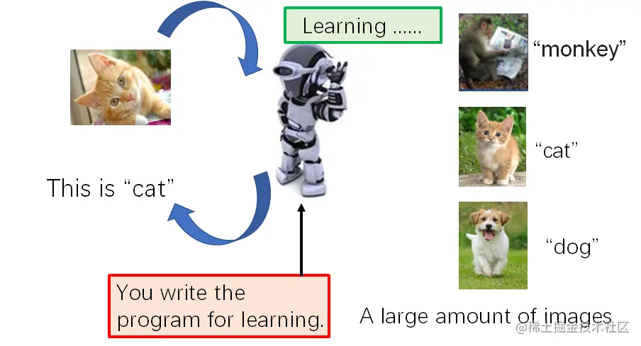 以图像识别为例。我们人为地给机器写一段程序,然后像教学生一样地告诉机器,这张图片是猫,另一张图片是狗等等,机器“学习”完成以后,你再给他看一张新的图片,假设给它看一张它完全没见过的猫的图片,此时,我希望机器能回答出:“这是猫”,如果机器就是这么回答的,那么,我们可以认为机器已经学会了图像识别任务。