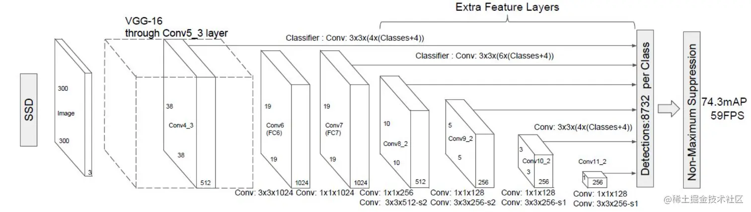 SSD采用VGG16作为基础模型,然后在VGG16的基础上新增了卷积层来获得更多的特征图以用于检测。SSD的网络结构如图所示: