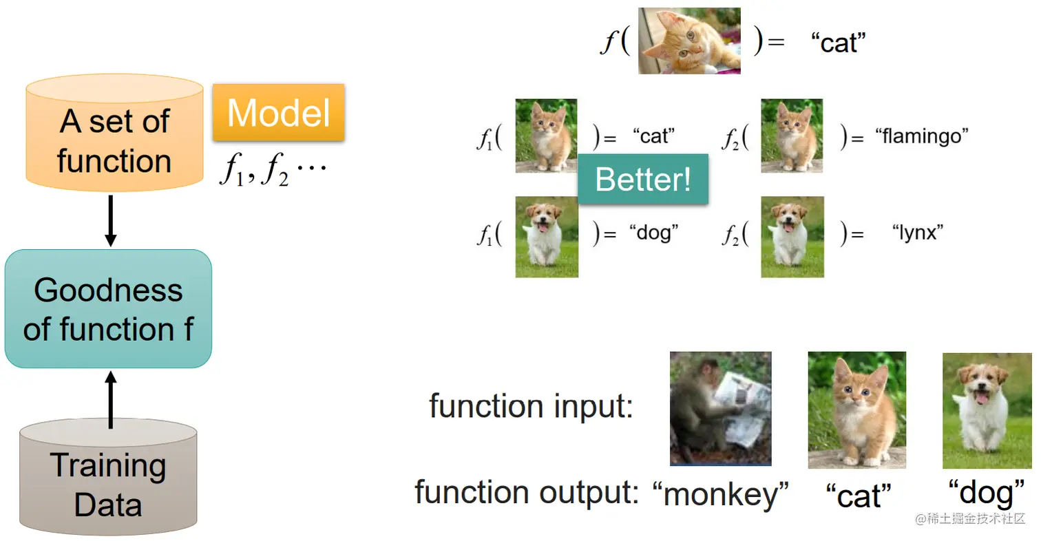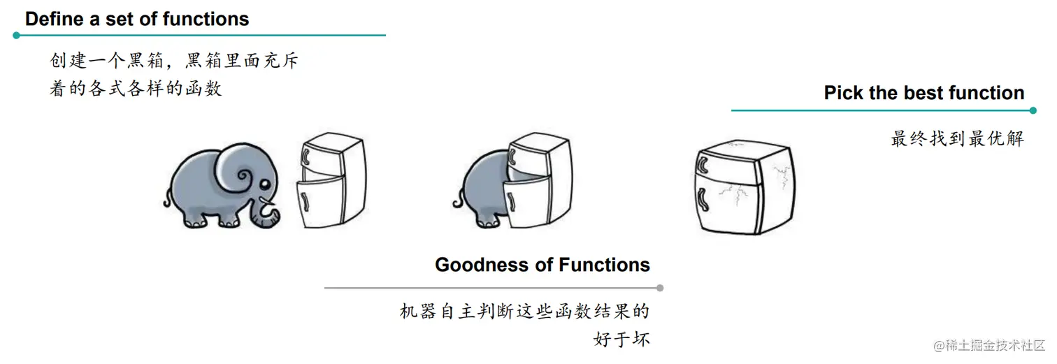 其实机器是在一个假设空间中寻找最优解的,哪一个函数能尽可能地拟合输入数据,那么机器就认为那个函数效果较好: