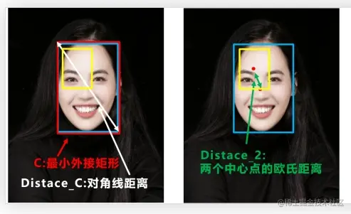 - 第二步,求出两个框中心点的欧式距离,这欧式距离就能衡量两者的相交情况。