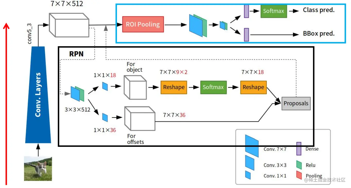 首先输入图片,然后对图片进行深度特征提取(经过卷积神经网络,称之为主干网络),然后通过RPN网络完成传统目标检测算法中滑动窗口所完成的任务(也就是产生候选区域)同时完成对候选框的分类(这个分类过程就将后选区分为 背景 和 目标 两个类别)并且RPN网络会对目标的位置进行初步的预测。
