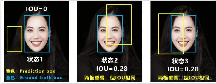 例如 状态 2 和 3,两个框相交的情况完全不一样,但是 IoU 相同。