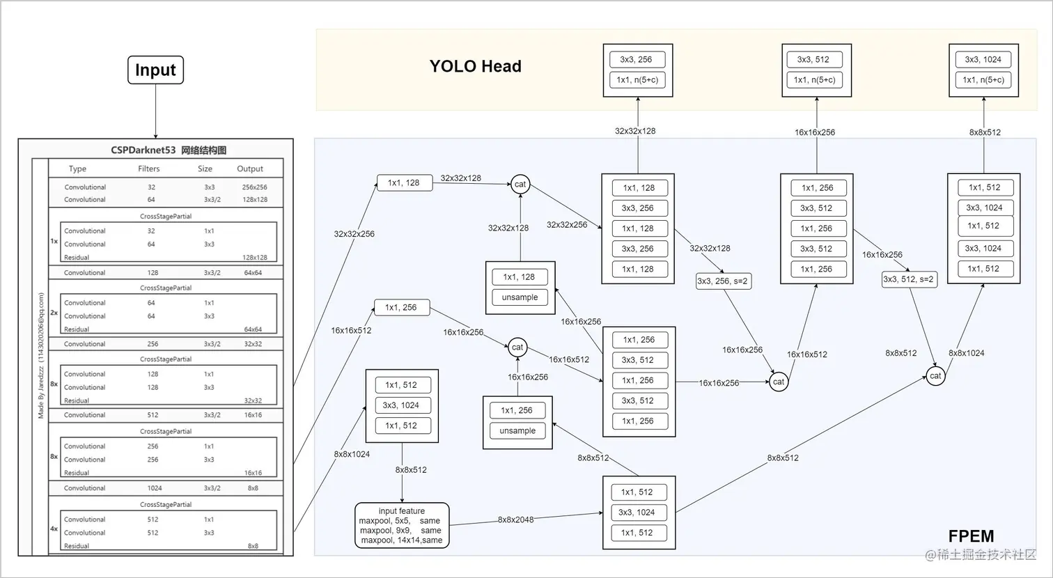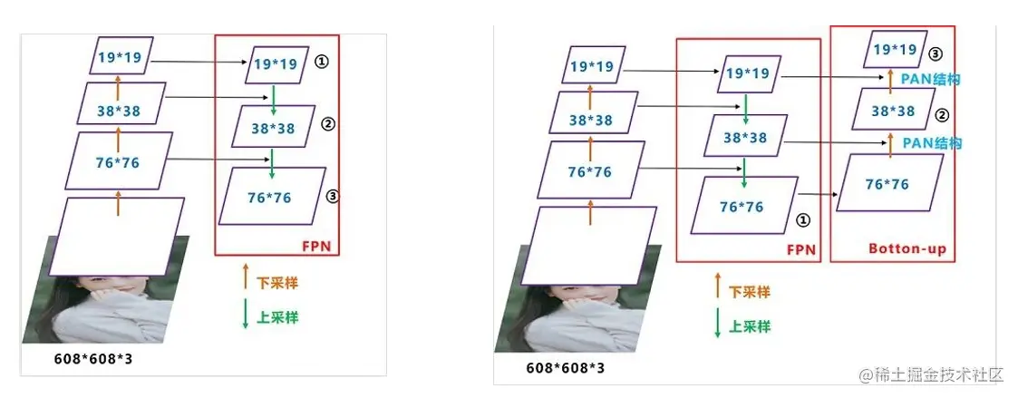 它其实是在 YOLOV3 的基础上增加了一个自底向上的 PANet 结构,特征图的尺寸是通过下采样得到的,而下采样是通过卷积的方式实现的(改变滑动窗口的步长)。