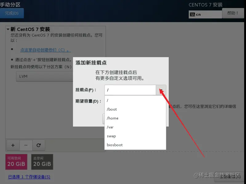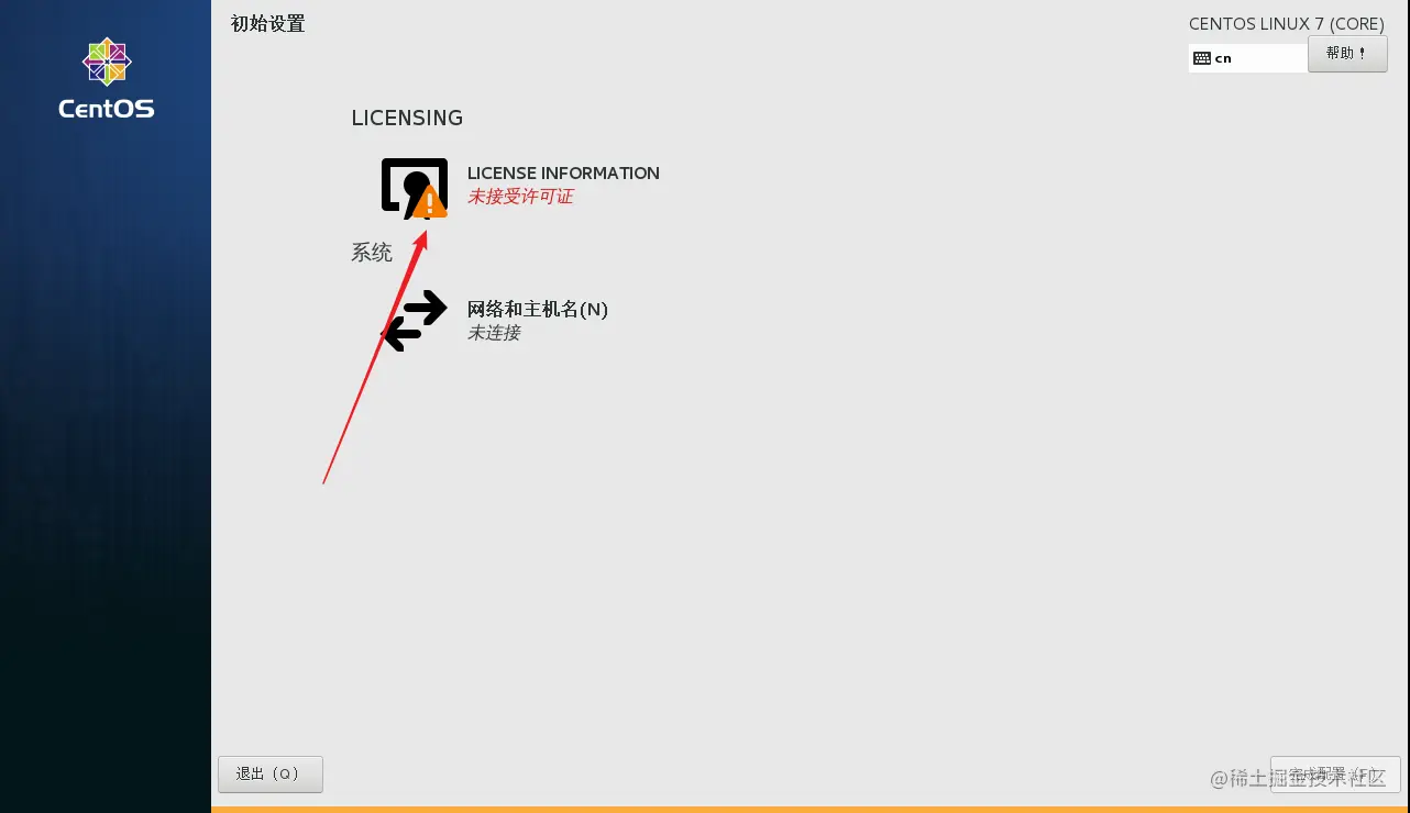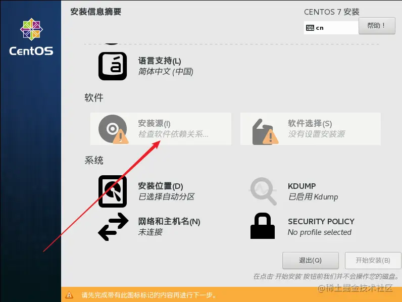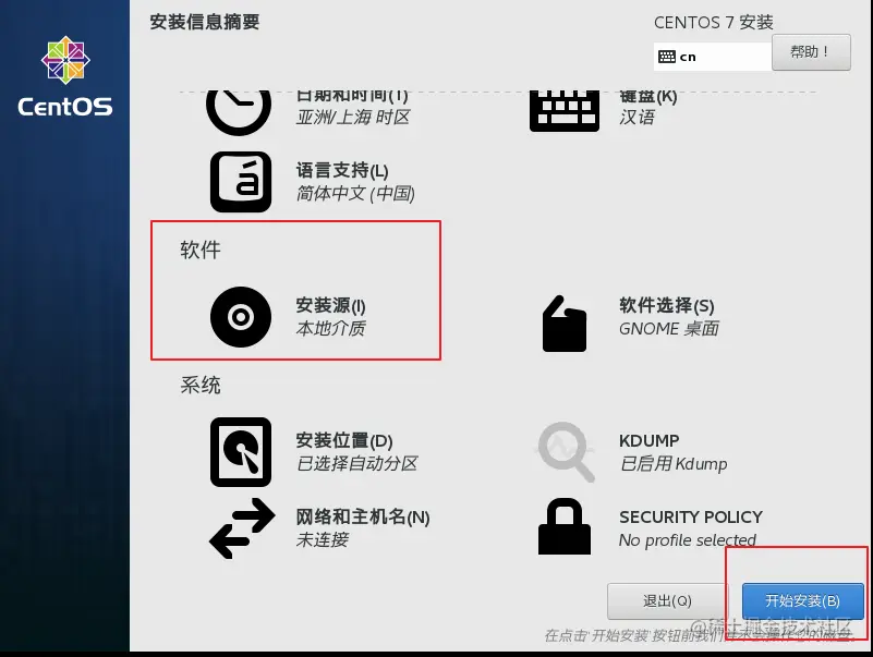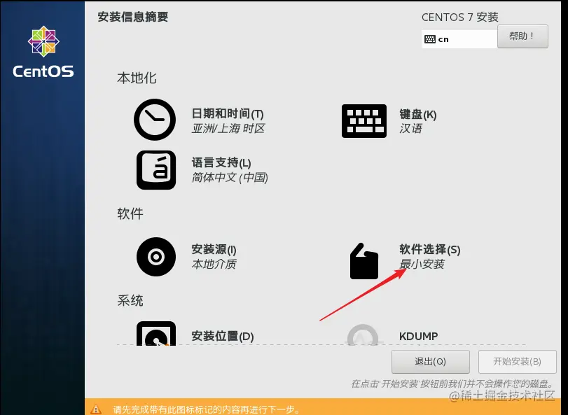 14继续后点击软件选择(centos7 默认最小安装不带桌面)