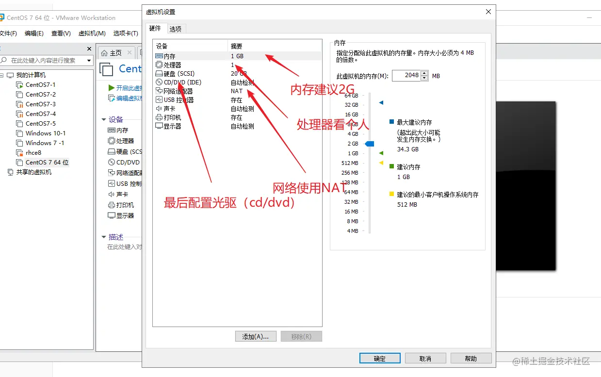 9 内存建议2G,处理器1-2个,网络选择NAT,最后点击光驱(根据个人的机器来调整)