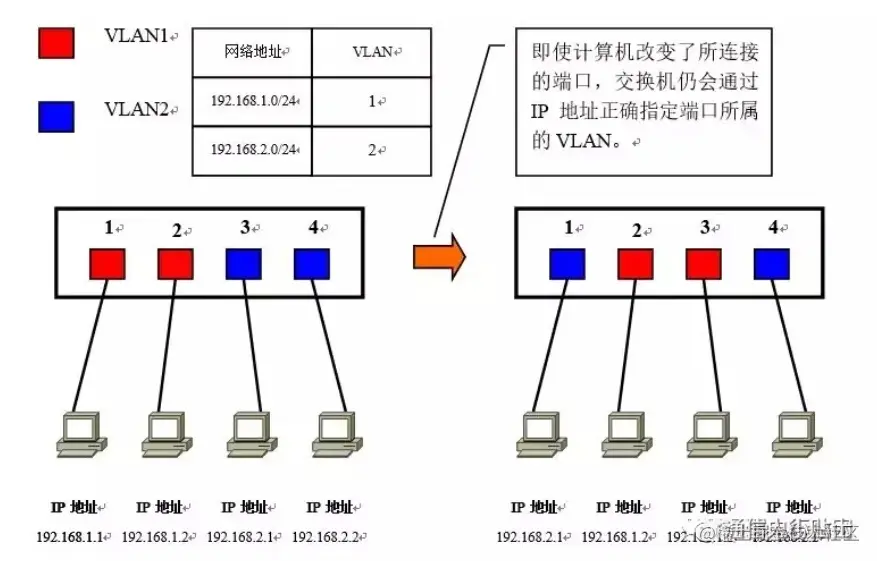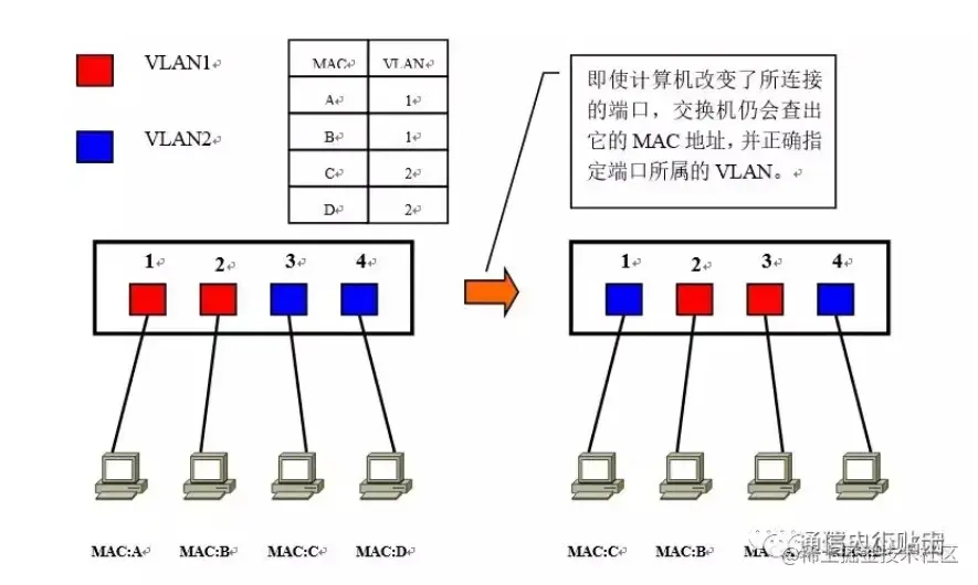 说白了,只要电脑ip地址不变,那么它的vlan就不变,很方便,计算机可以换交换机端口,也可以MAC地址了,都不影响。