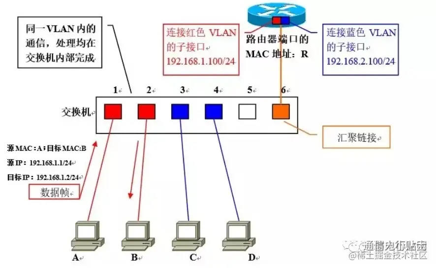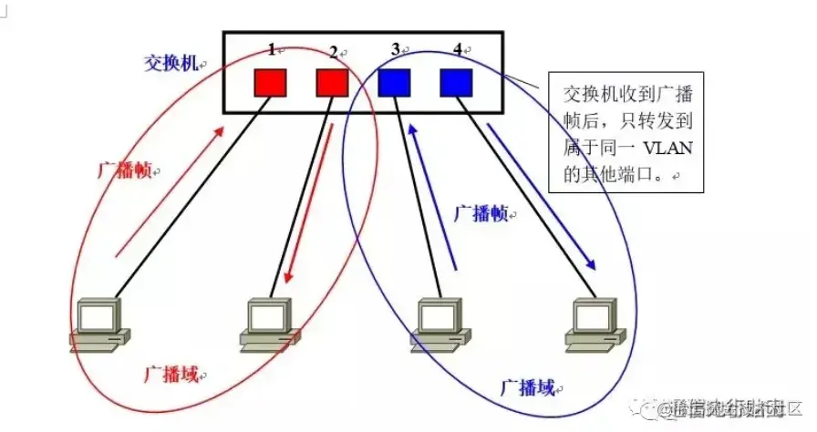再从A发出广播帧的话,交换机就只会把它转发给同属于一个VLAN的其他端口——也就是同属于红色VLAN的端口2,不会再转发给属于蓝色VLAN的端口。